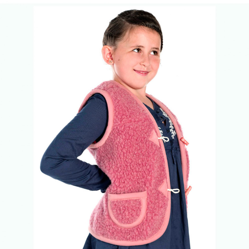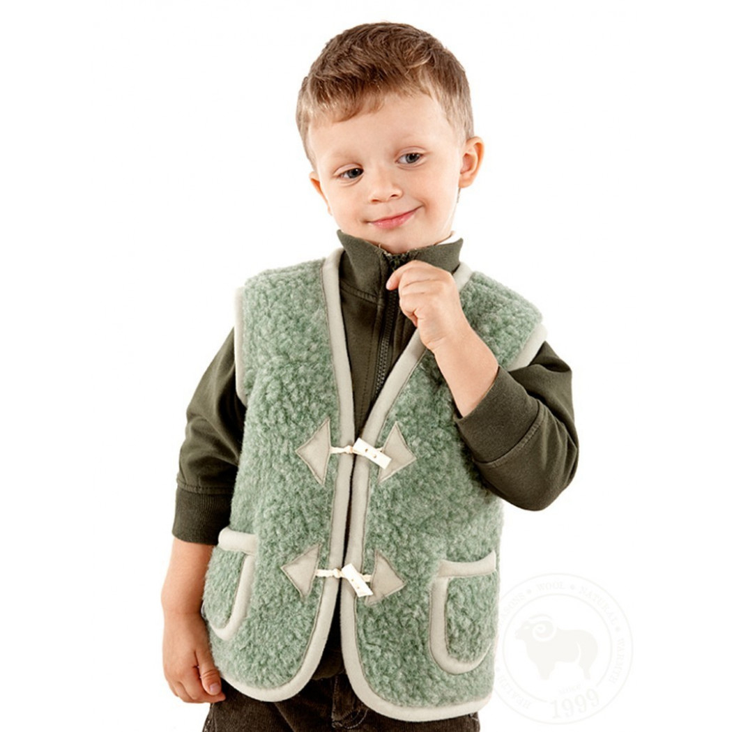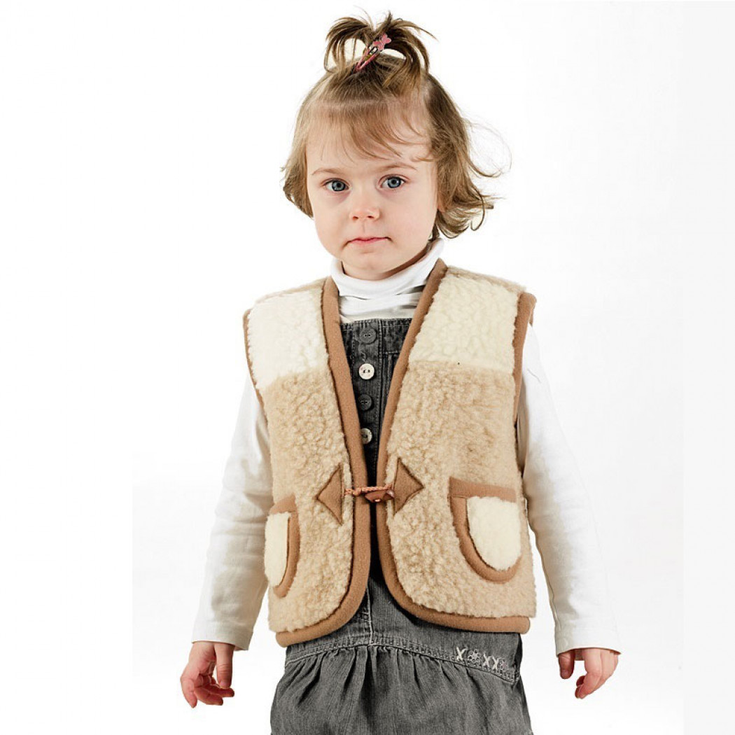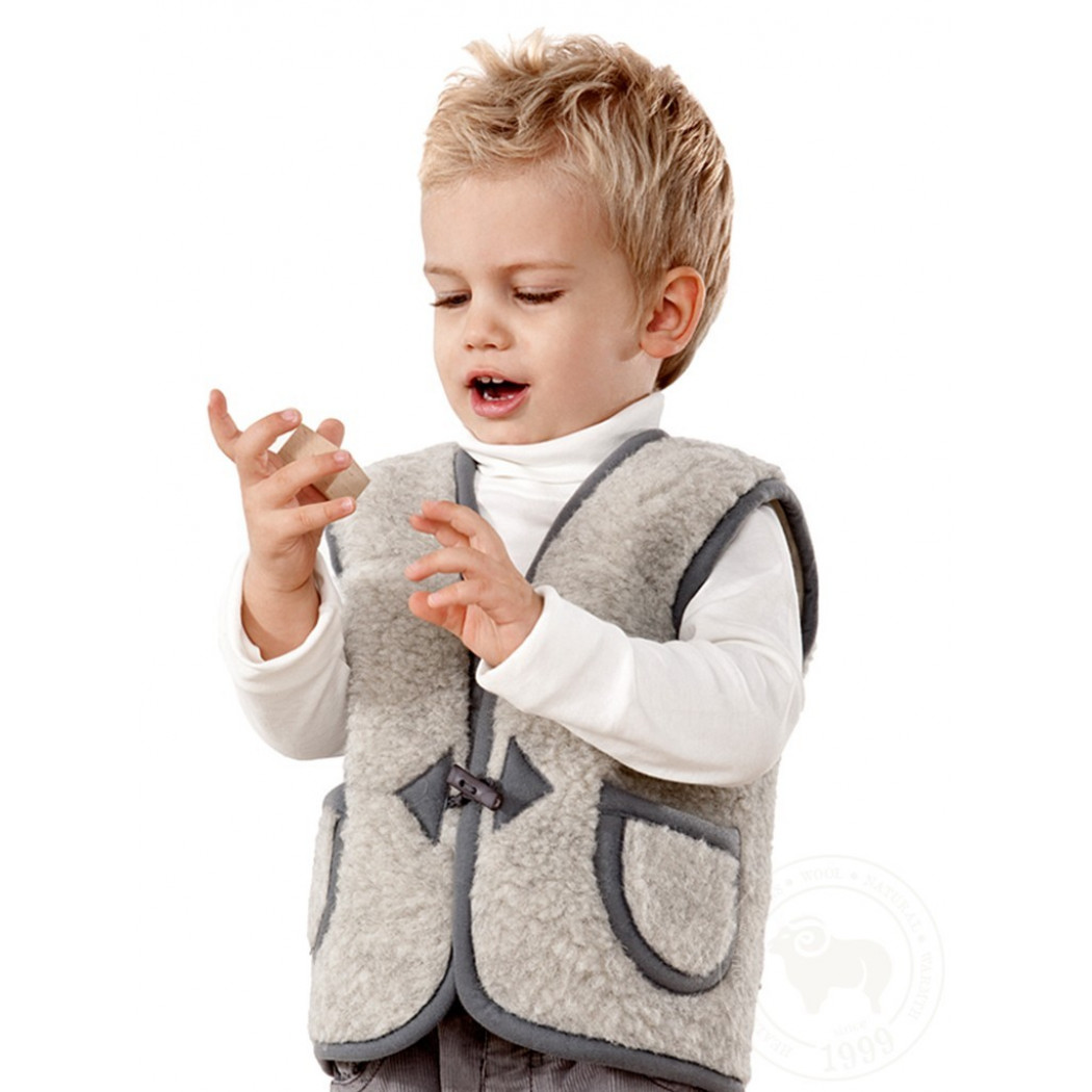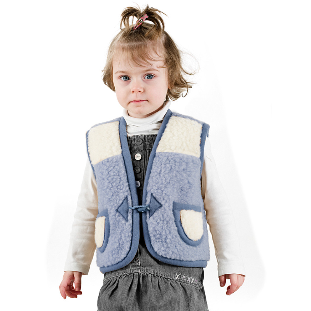 Dětská vesta z ovčí vlny se zapínáním na knoflíky chrání vaše děti proti chladu a průvanu. Vesta má po stranách malé kapsičky (kromě velikosti XS) a díky ovčí vlně je vaše dítě v konstantní teplotě, kterou pravá ovčí vlna udržuje.