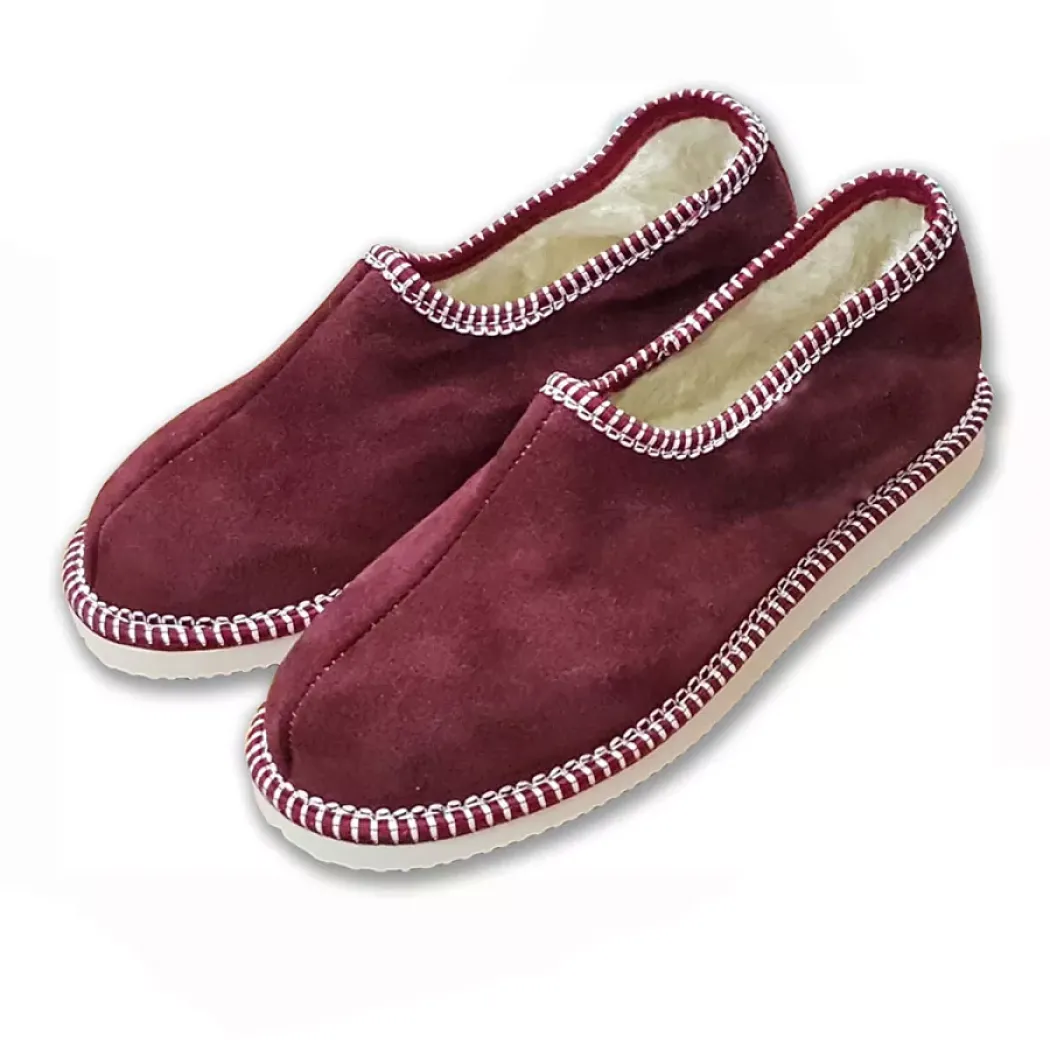 Pohodlné domácí pantofle s ovčí vlnou ve vínové barvě s podrážkou tlumící nárazy. Uvnitř pantoflí se nachází ovčí vlna. Pantofle mají uzavřenou patu.
